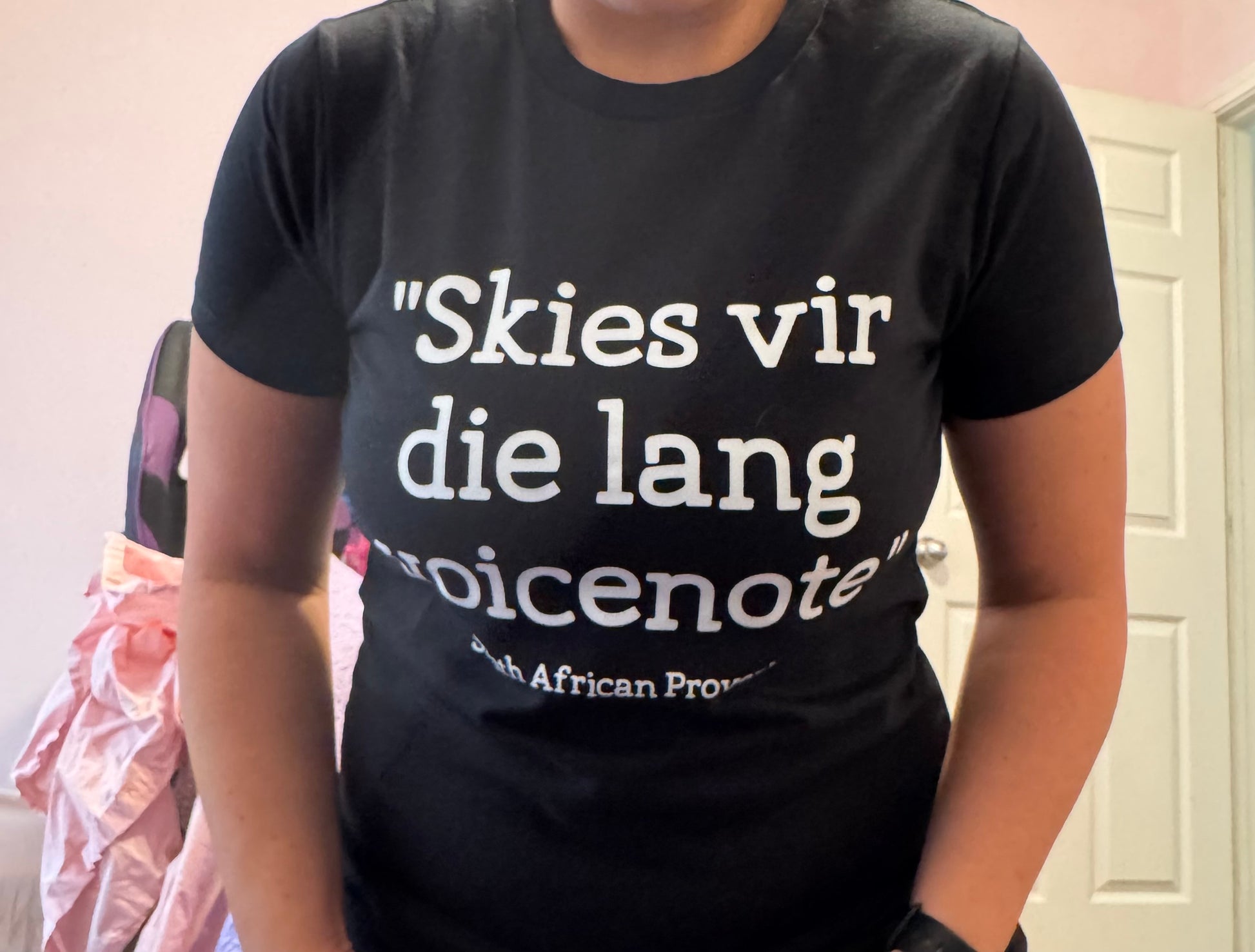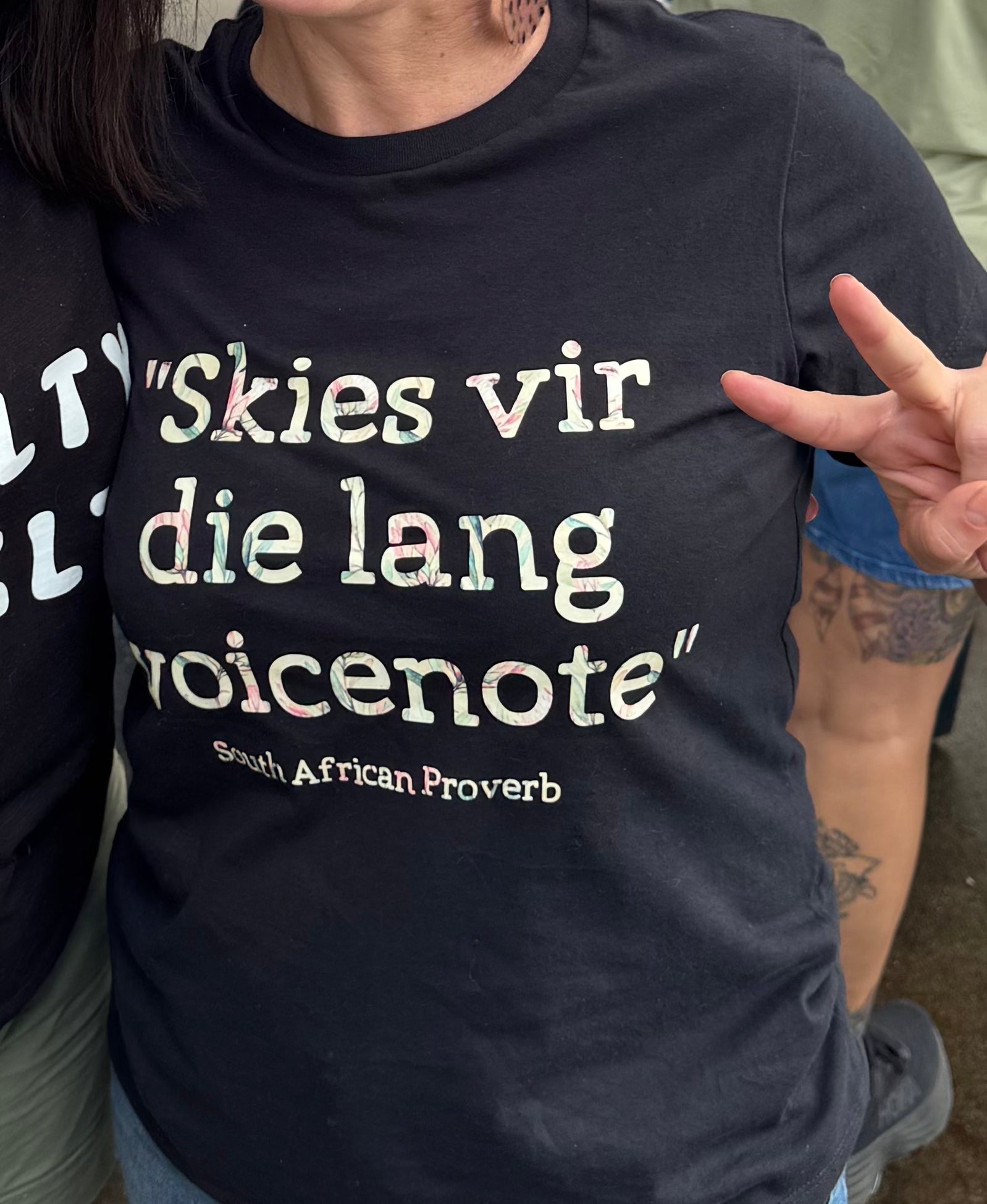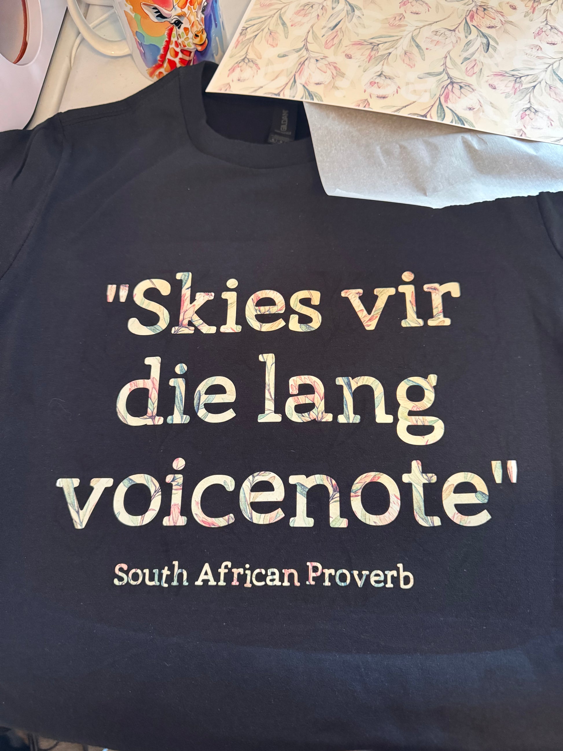 “Skies vir die lang voicenote” Afrikaans t-shirt.